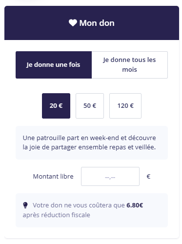 1 - Il choisi le montant et la fréquence : ex je donne 1 fois la somme de 20€