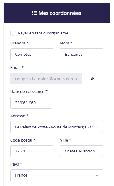2- Il complète ses cordonnées exactes, elles seront utilisées pour l'établissement du reçu fiscal