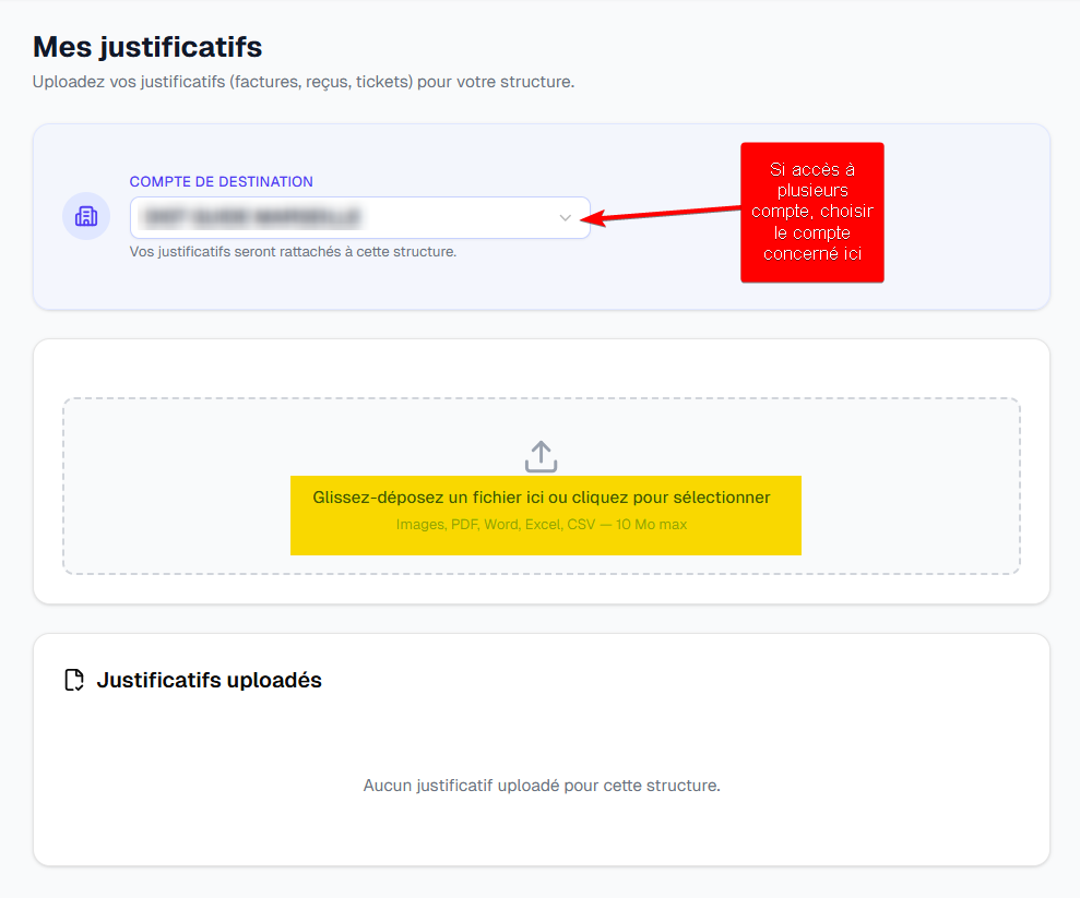 Si tu es inscrit sur plusieurs structures, choisis la structure concernée par le menu déroulant "compte de destination"